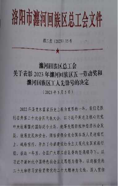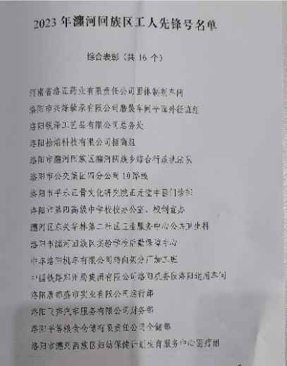 【概要描述】2023年5月5日上午9時(shí)许,洛阳市瀍河区五一(yī)表彰大要和(dà)會(huì)在洛阳市中关村协同创新中心举行。河南安华动司你物药业有限公司固体制剂車(chē)间荣获2022年度“工(gōn看道g)人先锋号”荣誉称号,接受瀍河区总工(gōng)會(huì)的授知飛牌。